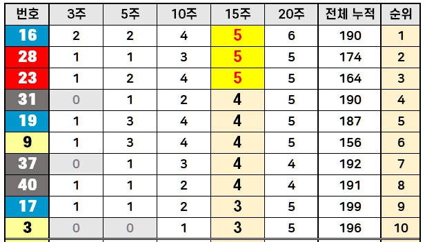 최근 15주간 당첨횟수를 보면 16번, 28번, 23번이 각각 5회씩 나와 최상위권을 차지하고 있습니다.