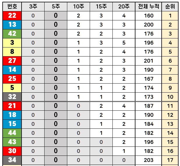 기간을 5주로 설정하고 조회하면, 최근 5주 동안 나오지 않은 번호들이 역대 출현횟수와 함께 표시됩니다. 이 중에서 역대 출현횟수가 높은 번호들을 예상번호 후보로 선정할 수 있습니다.