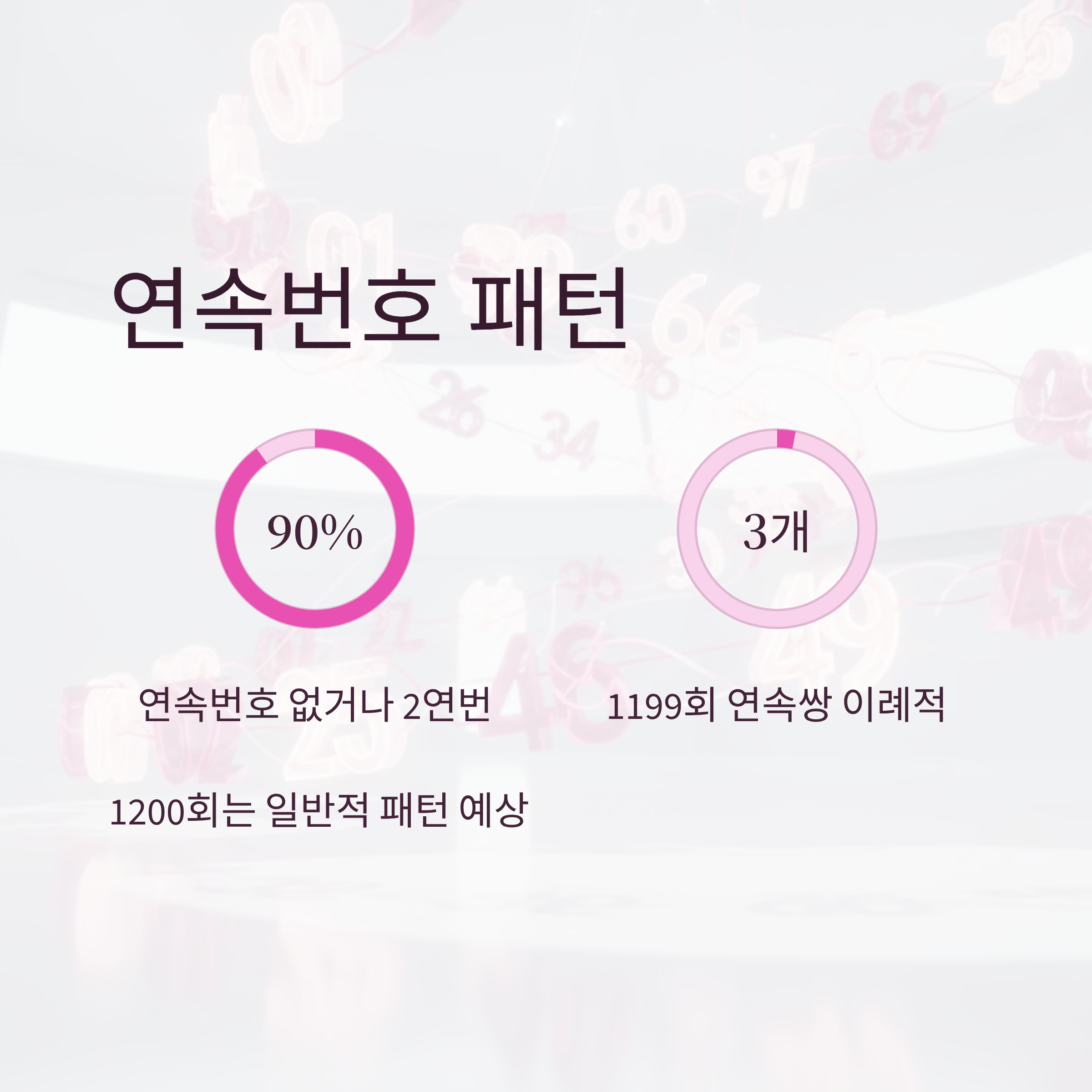 1199회 당첨번호의 특징은 연속쌍이 3개나 포함되었다는 점입니다. 24-25, 30-31, 31-32번이 연속으로 나타났는데, 역대 통계상 연속번호가 없거나 2연번이 나오는 경우가 90% 이상입니다. 3연번 이상은 매우 드문 경우로 1200회에는 이런 극단적 패턴은 피하는 것이 좋습니다.